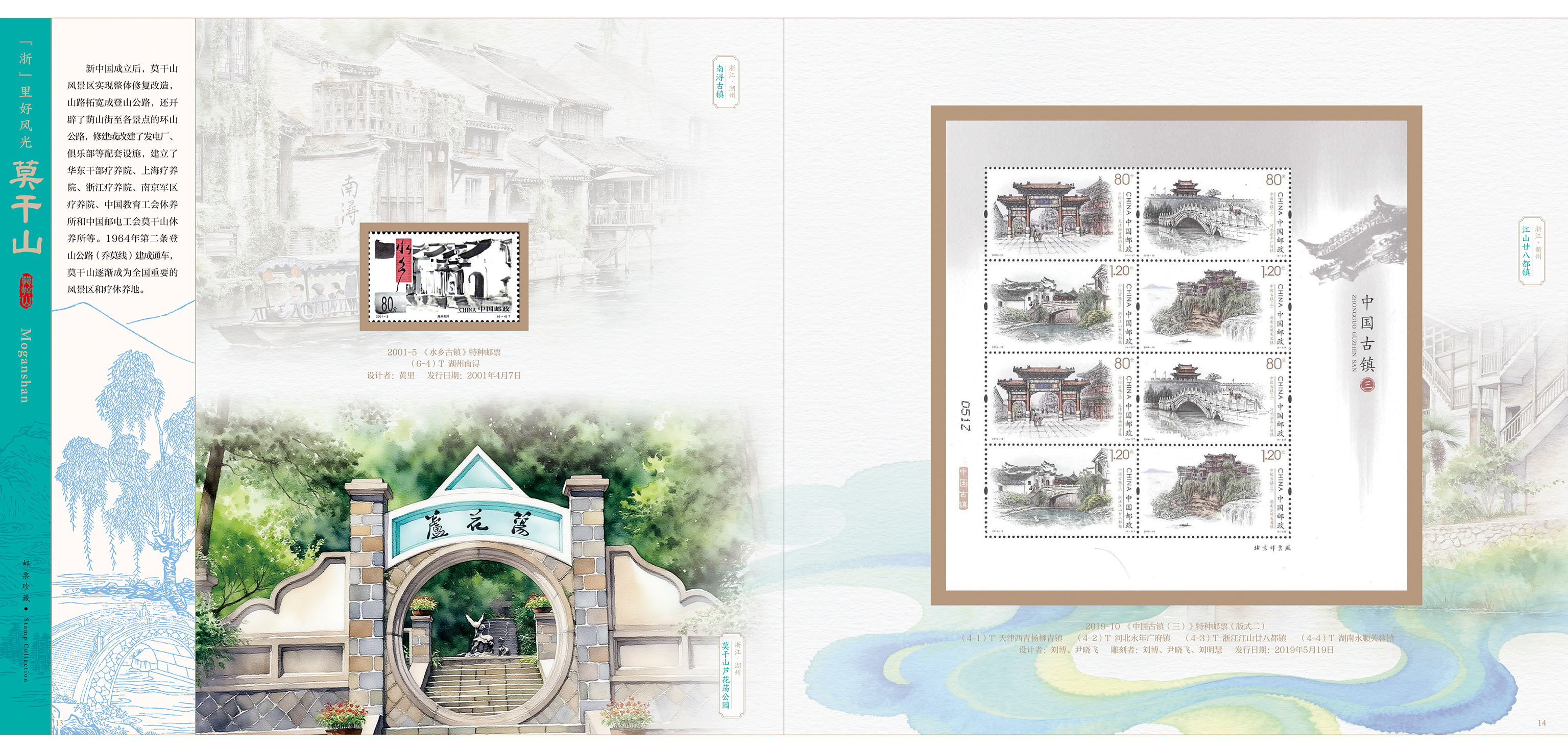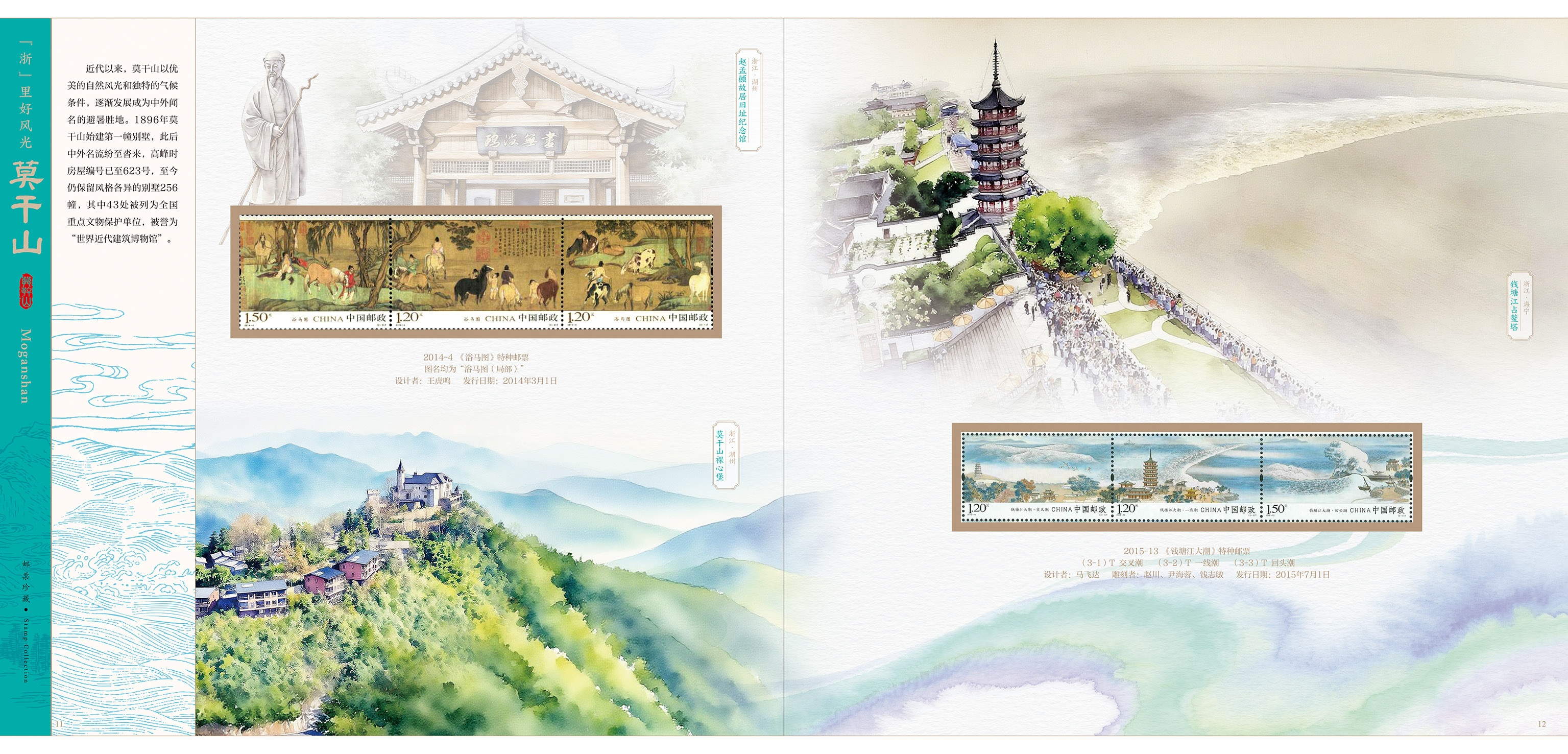 《莫干山》小版、《莫干山》方连、《国家考古遗址公园》、《钱塘江大潮》、《中国古镇(三)》小版、《杭州第19届亚洲运动会》小版、《竹》主图个性化邮票原票、《浴马图》、《水乡古镇》(图4)、《茶》(图1、2),以及《莫干山》首日封和《莫干山首发式》纪念封各一枚。