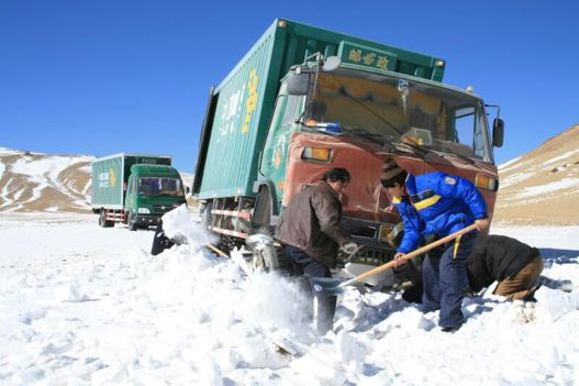 邮车抛锚,桑布和同事正在抓紧铲雪