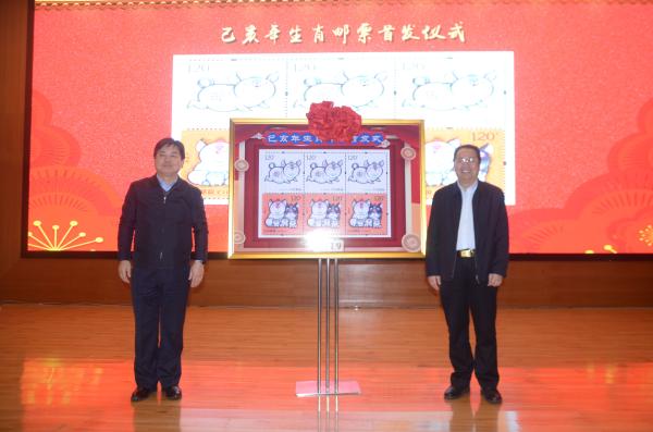 1月5日,全省各市州分公司举办了形式多样、精彩纷呈的《己亥年》特种邮票首发式。《己亥年》特种邮票1套2枚,全套邮票面值2.40元。这套邮票由著名艺术家、北京奥运吉祥物“福娃”之父韩美林设计。2枚邮票分别为《肥猪旺福》和《五福齐聚》。《肥猪旺福》上的肥猪肚藏乾坤,憨态可掬,以奔跑的姿态表现灵动生风的喜感,象征着正在奔向美好的生活;《五福齐聚》是首次在一枚生肖邮票中完整体现“全家福”的概念。两只大猪和三只小猪同时出镜,其乐融融,寓意新春佳节合家团圆、五福临门的美好祝福。图为株洲分公司举办的首发式现场。株洲市委常委、宣传部部长聂方红(右)与省公司副总经理刘绍权(左)在共同为《己亥年》特种邮票揭幕。罗磊/摄影报道