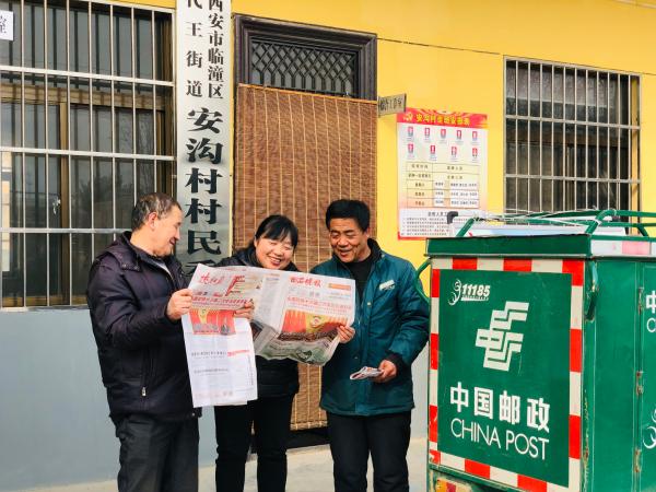 近日,西安市分公司对党报党刊实行“专车、专线”运输,采取有效措施,提升服务质量,优化作业组织,确保第一时间将“两会之声”传递至用户手中。图为西安市临潼分公司投递员及时将《人民日报》《陕西日报》等党报党刊送到乡镇村委会。