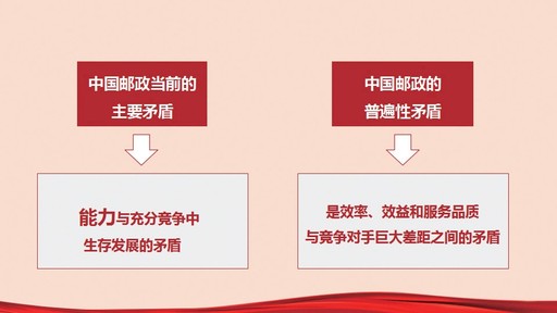 中国邮政当前的主要矛盾是什么?党课提出,是能力与充分竞争中生存发展的矛盾。除了普遍服务以外,我们的所有业务全部是充分竞争的行业,可我们的竞争力却并不容乐观。大家可以认真思考一下,我们寄递业务的竞争力是什么?邮储银行的竞争力是什么?中邮保险的竞争力是什么?农村电商有没有竞争力?因此,中国邮政当前的中心任务就是要通过“三个视角,一个提升”(客户的视角、竞争的视角、行业最佳实践的视角,自我提升),立标对标达标,提升全要素生产率,建立竞争优势;遵循“三大规律”(行业规律、市场规律、价值规律),深化体制机制改革,实现“五大突破”,将中国邮政打造成行业的“国家队”。“如果完成不了这个中心任务,无论我们多么辛苦、多么努力,都将一事无成”。