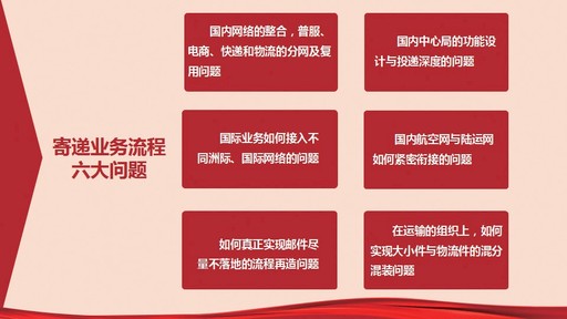 我们现在在流程方面主要有六大问题,大家一定要认真研究解决。一是国内网络的整合,普服、电商、快递和物流的分网及复用问题。哪些地方需要分网?是基于流量还是基于客户不同的需求?到底怎么办?德国邮政DHL有完全独立的四大公司,是四个独立的法人,但是DHL在德国农村仍然是一个网络服务,我们怎么办?二是国内中心局的功能设计与投递深度的问题。要研究是不是需要一个个孤立的分拣中心,然后经过三次、四次分拣,不停落地?要不要集包?能不能直接分拣到段道口?三是国际业务如何接入不同洲际、国际网络的问题。四是国内航空网与陆运网如何紧密衔接的问题。DHL在莱比锡有一个分拣中心,他们的航运中心一边坐着陆运的人,一边坐着空运的人,中间坐着所谓的管理层,天气预报的大屏幕就在后面,一旦出现问题,比如哪个国际方向不能飞了,改陆路怎么改,几个部门的人一协商,马上进行车辆调度,然后就可以从空运转陆运,同样可以实现次日递或者隔日递。而我们南京集散中心,有没有陆运的人?空运和陆运怎么结合?不能因为天上打个雷,飞机不能落地就不运了,结果客户寄的樱桃烂了,草莓也烂了。五是如何真正实现邮件尽量不落地的流程再造问题,我们这里说的11个环节、18个过程,实际上还不止这些,中间还有几次分拣。六是在运输的组织上,如何实现大小件与物流件的混分混装问题。这些问题都是影响我们生产效率的核心问题,大家一定要认真研究解决。所以,我们说首先要解决“有人看、有人干”的问题,就是要让大家多看报表、多找问题,然后研究解决改善的办法。