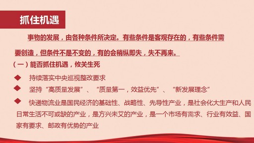 能否抓住机遇,攸关生死。当前,我们要以持续落实中央巡视整改要求为契机,认真查找企业改革发展中存在的问题,以整改促发展,坚持问题导向,坚持高质量发展,坚持质量第一、效益优先,坚持新发展理念,努力打造行业的“国家队”。比如,快递物流业是支撑国民经济发展的基础性、战略性、先导性产业,是社会化大生产和人民日常生活不可或缺的产业,是方兴未艾的产业,是一个市场有需求、行业有效益、国家有要求、邮政有优势的产业,我们必须抢抓机遇、加快发展,否则,我们就会彻底丢掉这个市场,丢掉核心业务,邮政何以立足。