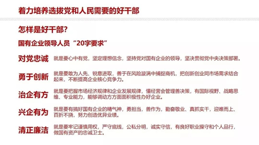在全国国有企业党的建设工作会议上,习近平总书记对国有企业领导人员提出了对党忠诚、勇于创新、治企有方、兴企有为、清正廉洁的“20字要求”。刘爱力在领学时表示,中国邮政将习近平总书记对国有企业领导人员的“20字要求”作为选拔干部、培养干部、考核干部的根本遵循,严格贯彻执行《党政领导干部选拔任用工作条例》,坚持好干部标准,把政治标准放在第一位。