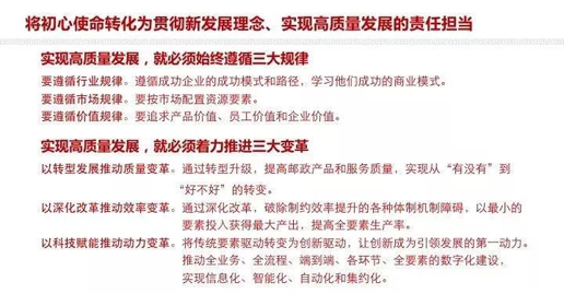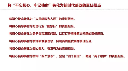 根据中央要求,结合邮政实际,刘爱力强调指出,中国邮政要将“不忘初心、牢记使命”转化为新时代邮政的责任担当,切实做到“六个转化”。