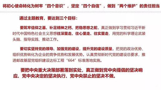 不忘初心再出发,牢记使命勇担当。在举国上下喜迎新中国成立70周年之际,集团公司党组按照中央部署,以上率下,团结带领各级党组织和广大党员干部,树牢“四个意识”、坚定“四个自信”、做到“两个维护”,切实增强政治自觉、思想自觉、行动自觉,有力有序有效推进主题教育深入开展,将初心使命转化为新时代邮政的责任担当,做到学思用贯通、知信行统一,确保主题教育取得扎扎实实的成效,以主题教育的成效推动邮政改革发展、创新转型取得新突破、迈上新台阶。