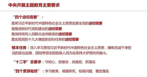 开展这次主题教育,就是要坚持思想建党、理论强党,坚持学思用贯通、知信行统一,推动广大党员干部不断增强“四个意识”、坚定“四个自信”,坚决做到“两个维护”,最关键的是坚决维护习近平总书记党中央的核心、全党的核心地位,做到“三个体现在”:体现在与党中央保持高度一致上,体现在严守党的政治纪律和政治规矩上,体现在坚决贯彻落实党中央重大决策部署上。