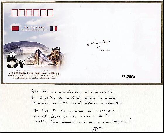 日前,中法建交55周年纪念封设计者马小玲一行专程前往法国驻华使馆拜会驻华大使黎想。黎想大使欣然在中法建交55周年纪念封样封上为中国集邮爱好者题写祝福语:在这个充满纪念意义的年份,我衷心感谢中方发行此枚纪念封,希望中国留法勤工俭学运动的先行者和中法关系的开拓者们的精神能让我们不断受到新的启发。