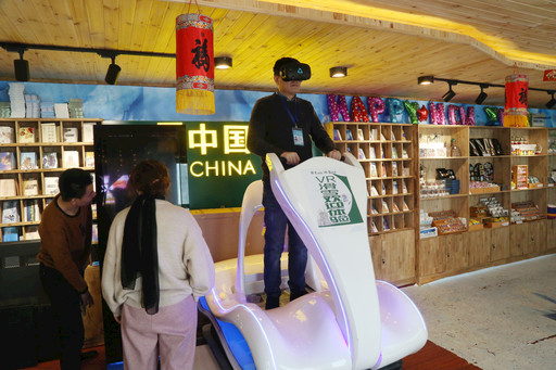 游客在冰雪大世界主题邮局体验VR滑雪。