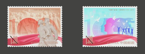 天安门广场上矗立的人民英雄纪念碑“五四运动”浮雕,无疑是最没有任何争议,最能够代表五四精神的艺术作品。新中国历史上发行过的所有纪念“五四运动”题材的邮票无一例外的都使用了这一素材。为了区别于已经发行过的相同题材邮票,此次一百周年纪念并没有完全以这一经典浮雕作品作为邮票的表现对象,而是把尽可能于方寸之上全面而丰富的呈现“五四运动”的重要内涵和意义作为设计的主要目标。为了达到这个最终目的,我借助了一种文学上的修辞方法——借喻。通过借喻,我们可以将抽象的概念转化为具象的物件,而使邮票画面里内容具有了更加丰富的内涵。具体来说,第一枚邮票(以下简称一图)以红、棕、黄等暖色作为主要基调,有效地突出了历史的厚重味道,营造了历史氛围。第二枚邮票(以下简称二图)则以蓝色作为主要色调,是新时代的所具有的色彩,是未来、理想的色彩。这是整体色彩上的借喻。数字“100”作为主要表现元素,在两枚邮票中也被分别赋予了不同的含义。一图中,中间的数字“0”以初生的太阳来呈现,寓意了“五四运动”是由青年学生发起并发展的,同时也寓意中国共产党在“五四运动”的催生下,即将登上历史舞台,为新中国的建立带来了曙光。而二图中的“0”则转化为地球的形象,寓意了新时代背景下,中国的青年将走向世界,在全世界的瞩目下,展现出新的风采。同时,为了不使变化元素冲淡一百周年的概念,借助光油的印刷工艺,对数字“100”进行了再次强化,增加了邮票画面的表现层次,丰富了邮票的表现内容。两枚邮票中统一出现的红绸带,是中国共产党的指代。这里要特别提一下,之所以没有使用飘扬的红旗来比喻党,是因为当时中国共产党尚未成立,“五四运动”的发生是党的摇篮,为党的建立提供了思想上的准备。放飞的白鸽是和平的象征,也是放飞的理想。远处的建筑和装饰圆点则寓意了千千万万的青年人,在新的时代背景下,正以无比的热情投入到伟大祖国各行各业的建设之中。