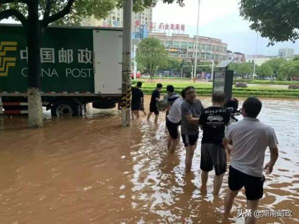 面对严峻的汛情,湖南邮政第一时间全面展开抗洪救灾工作,尽最大可能确保邮政通信畅通。在株洲市攸县、衡阳市衡东县、永州市冷水滩区、邵阳市绥宁县等受灾严重的地区,邮政分别采取绕道、接运、人力疏运等方式传递邮件,省、市、县分公司各支撑单位(部门)与受灾单位建立24小时不间断联系,保证了灾区邮件的有效疏运,确保人员安全、邮路畅通、邮件和资金万无一失。图为株洲市邮政分公司干部职工用双手将受灾网点的邮件、凭证、设备等转移到安全地带,把损失降至最低,尽最大努力压缩邮件在途时间。□刘园园 胡琪 摄影报道