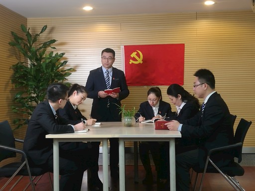 北京分行机关党支部书记皮震环(左三)结合党的十九大精神为党员讲党课。