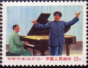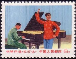 李玉和,8分。 李铁梅,8分。 1969.8.1。影写版。P11×11.5。40mm×30mm。50(5×10)。[G]。 李大玮。北京邮票厂。印5000万枚。 『文16发行背景』 《红灯记》是一出描写中共地下党为保护和安全传递一份密电码而与日本侵略者机智周旋、勇敢斗争的现代京剧。这是一部“文化大革命”期间流传很广的戏剧。它在当时文艺界产生了很大影响。1968年,中国京剧团和中央乐团根据它改编创作了钢琴伴唱《红灯记》,并于六七月间在北京首次上演,反响很大。
