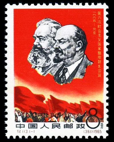 361)8分 在马克思、列宁主义旗帜下前进 1965.6.21。影写版。P11.5×11。26.5mm×36mm。50(10×5)。[G]。李斛、卢天骄。北京邮票厂。 1965年6月21日在我国召开了“第六次社会主义国家邮电部长会议”。根据第五次会议的决议,中国将负责这次会议向各成员国提供邮票设计图稿,并完成统一发行同题材邮票的组织工作。从而出现了一套多国采用中国提供的邮票图案,联合发行的邮票。