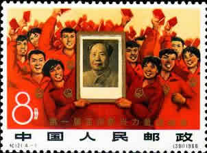 第一枚“中国运动员热爱毛主席”,表现了运动会召开时的热烈场面,身着红色运动服的运动员们手里挥舞着《毛主席语录》,创造了红海洋的气氛。