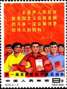 第二枚“团结反帝”,邮票上方印有毛主席1964年1月12日在《支持巴拿马人民反美爱国斗争的谈话》中的一段话:“全世界人民反对美帝国主义及其走狗的斗争一定会取得更加伟大的胜利。”
