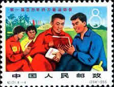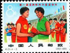 第四枚“互相促进”,表现了运动员们在比赛的间隙手捧《毛主席语录》,互相交流体会,具有鲜明的时代特征。