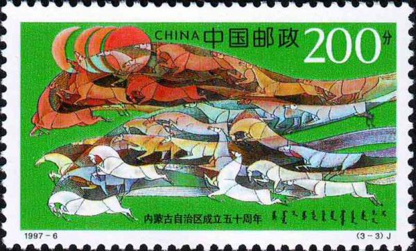 国家邮政局1997年5月1日发行《内蒙古自治区成立50周年》纪念邮票1套3枚。