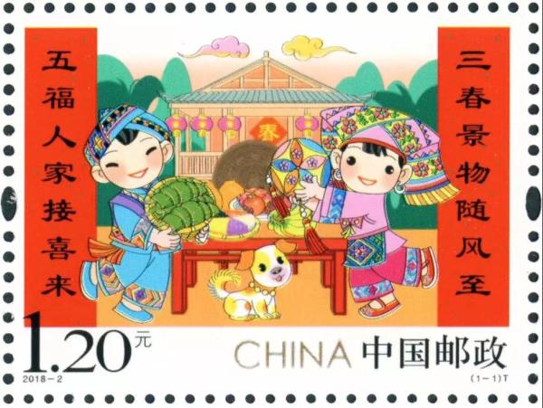 P.S. 邮票画面中的粽子象征着富裕丰收,热情好客的壮家人过年时就会拿出最好的食物招待客人。绣球则是壮家人的吉祥物,是壮家人传递爱情、亲情、友情的民族文化使者。中间桌子上摆放着柚子、香蕉、五色饭等当地特色水果和食物,打开的石榴籽粒饱满、颗颗相抱,背景衬以铜鼓和当地民居建筑,两侧的春联契合了“三春景物随风至,五福人家接喜来”的新春主题,整个画面轻松愉悦,洋溢着新年的喜庆画面。