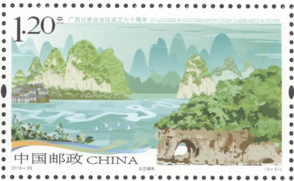 P.S. 2018年是广西壮族自治区成立六十周年。邮票采用电脑手绘的创作方法。第一图前景以广西民族博物馆主楼为主体,广西12个世居民族同胞身着传统服饰载歌载舞,欢庆自治区成立六十周年,中景为花山岩画、风雨桥和龙脊梯田,远景为壮族干栏式建筑和起伏的山峦,画面构图错落有致、色彩明快和谐,营造出自治区大庆热烈喜庆的氛围;第二图前景表现了南宁国际会展中心、船舶及塔吊,中景为奔驰的高铁列车和友谊关,远景为南宁东盟商务区建筑群,展现出广西经济社会发展的新成就;第三图前景为桂林象鼻山,中景为巴马命河,远景为层峦起伏的喀斯特地貌山峰,描绘出广西山清水秀的生态美景。