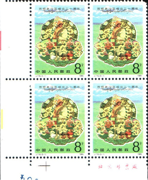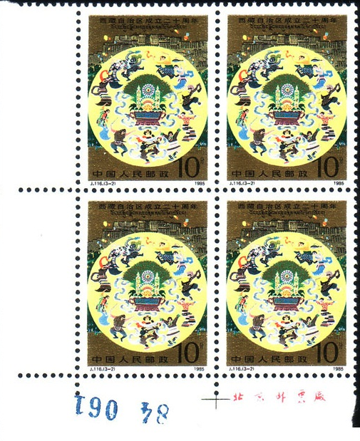 本组邮票采用藏族人民喜爱的古老画种——藏画(唐卡),以雪山、草原、布达拉宫为背景,主图采用藏族人民喜庆丰收的场面,描绘了西藏人民兴旺发展的景象。