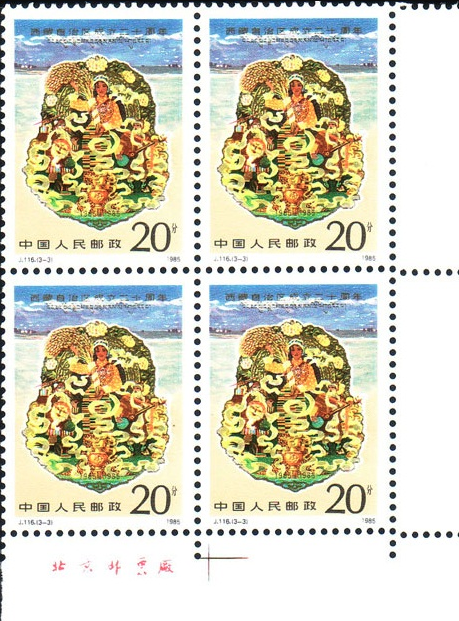 在3-1“兴旺”和3-3“丰收”两枚邮票上,人物背景衬以富有西藏民族特色的环形铜雕,外圈夹杂着“格桑梅朵”(西藏的幸福花)和雍容富丽的牡丹花,下方左右两侧都有飞舞着的洁白哈达。3-1中的主体人物是位高大健壮的藏族男青年。他背挎猎枪,手牵白色的骏马,满脸欢笑,威武雄壮。两侧是手捧藏族食品 的美丽姑娘,身姿婀娜,长发迷人。牧民的脚旁是温顺的绵羊和通灵的猎狗。主图后面衬以高入苍穹的雪山和广阔无垠的草原。整幅图案表现了西藏畜牧业的繁荣兴旺。3-3的主体人物是手捧青稞的藏族姑娘,充满丰收的喜悦。两侧是手持藏族乐器、载歌载舞的藏族老汉。主图的背景是蓝天、雪山和农田,色调温暖热烈。