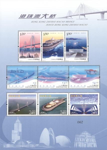 另与香港邮政、澳门邮电共同印制同题材邮票小全张1枚,内含中国邮政、香港邮政、澳门邮电邮票各3枚。小全张整张规格:140×195毫米。小全张设计者:史渊。小全张资料提供:港珠澳大桥管理局、中交公路规划设计院有限公司。小全张邮折售价:32元。
