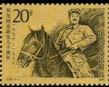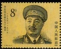 1986.3.22。影雕套印。P11*11.5 。 40mm*30mm。 50(5*10)。[G]。 [D]杨力舟、王迎春。 [E]呼振源、孙鸿年。 北京邮票厂。 2-1为“贺龙同志像”。画面是贺龙身穿元帅礼服的头部肖像。 2-2为“战场上的贺龙同志”。是贺龙在红军时代的形象。背景图案为战场上弥漫的硝烟。