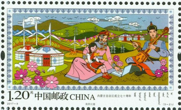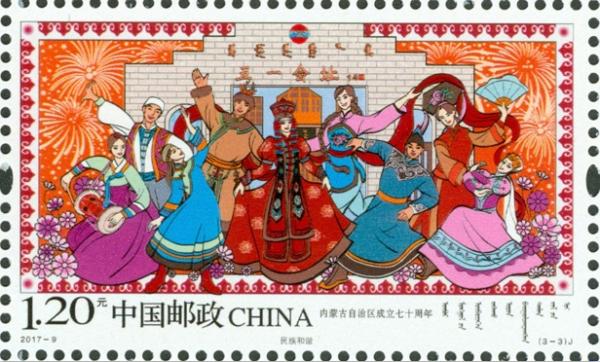 中国邮政2017年5月1日发行《内蒙古自治区成立七十周年》纪念邮票1套3枚。