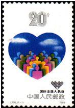 邮票画面为各种肤色人形组成的三角状联合国志愿人员徽志。邮票主题图案设计为心形。心形内由联合国志愿人员徽志和湛蓝色的天空两部分组成。图案中人形的排列呈“V”型,代表英文字“volunteer”(志愿人员)的缩写。
