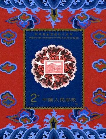 本票为小型张“欢庆”。 设计者将1952年发行的纪13“和平解放西藏”邮票的第1枚作主图,构成票中票的形式,增强了这套邮票的纪念意义。纪13邮票的主体是高耸险峻的布达拉宫。围绕着纪念邮票有七只仙鹤翩翩起舞,象征着西藏七个地市各民族的人民友好和睦。边饰为祥云和海水浪花图案,主色调呈普蓝和紫红色,渲染出古色古香的传统文化气氛,颇象一幅西藏的宗教绘画 “唐卡”。