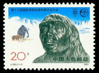 本套邮票共1枚。画面层次是以炭笔素描手法刻画北京猿人特写头像为主,以猛犸象和古犀牛为中景,并置于喜马拉雅山冰川的整体景观中。它概括了第四纪的重要生物与地貌特点。