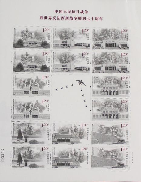 中国邮政2015年9月3日发行《中国人民抗日战争暨世界反法西斯战争胜利七十周年》纪念邮票1套13枚,小型张1枚。