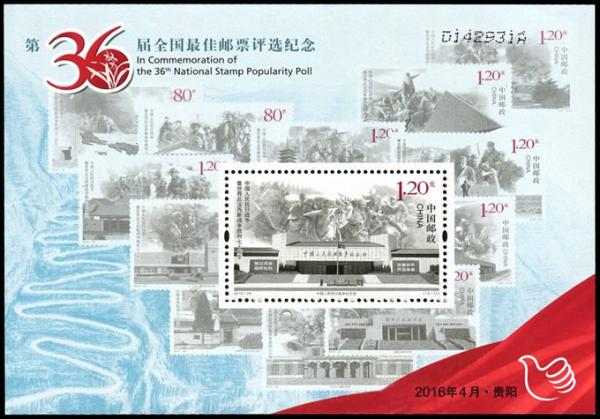 P.S. 为配合第36届全国最佳邮票评选颁奖大会,采用2015-20J《中国人民抗日战争暨世界反法西斯战争胜利七十周年》邮票第三图,制作第36届全国最佳邮票评选纪念张1枚,成品规格:136×96毫米。发行日期:2016年4月23日。