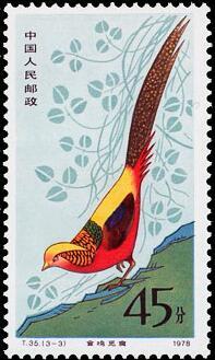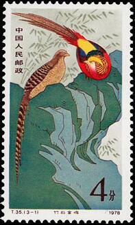 (1) 4分 竹石金鸡 800万枚 (2) 8分 金鸡展翅 800万枚 (3)45分 金鸡觅食 200万枚 1979.1.25。 影写版。P11.5。 31mm×52mm。 40(10×4)。刘硕仁。北京邮票厂。