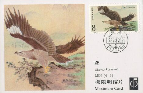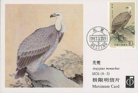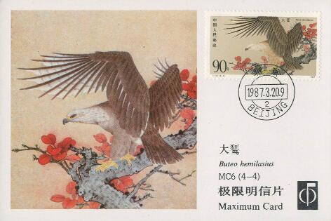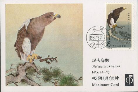 (1) 8分 鸢 1627.85万枚 (2) 8分 虎头海鵰(diao) 1657.35万枚 (3)10分 秃鹫(jiu) 1311.15万枚 (4)90分 大鵟(kuang) 625.75万枚 1987.3.20。影写版。P11.5。万一、程传理。北京邮票厂。 (1)(4)52mm×31mm、40(4×10)。 (2)(3)31mm×52mm、40(10×4)。