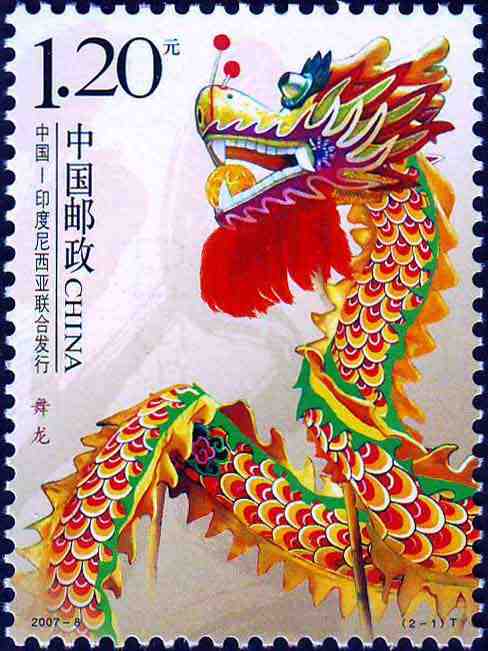 国家邮政局2007年4月13日发行《舞龙舞狮》特种邮票1套2枚。(与印度尼西亚联合发行)