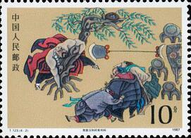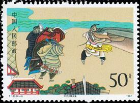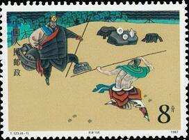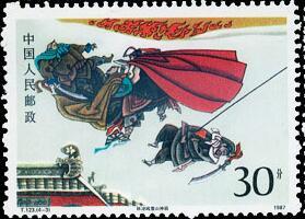 (1) 8分, 史进习武, 1807.2万枚。 (2)10分, 鲁智深倒拔垂杨柳, 1068.8万枚。 (3)30分, 林冲风雪山神庙, 1148.25万枚。 (4)50分, 宋江义释晁盖, 879.1万枚。 1987.12.20。影写版。P11。54mm×40mm。28(4×7)。 周峰。北京邮票厂。