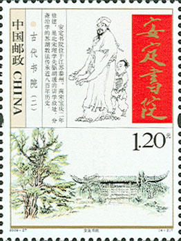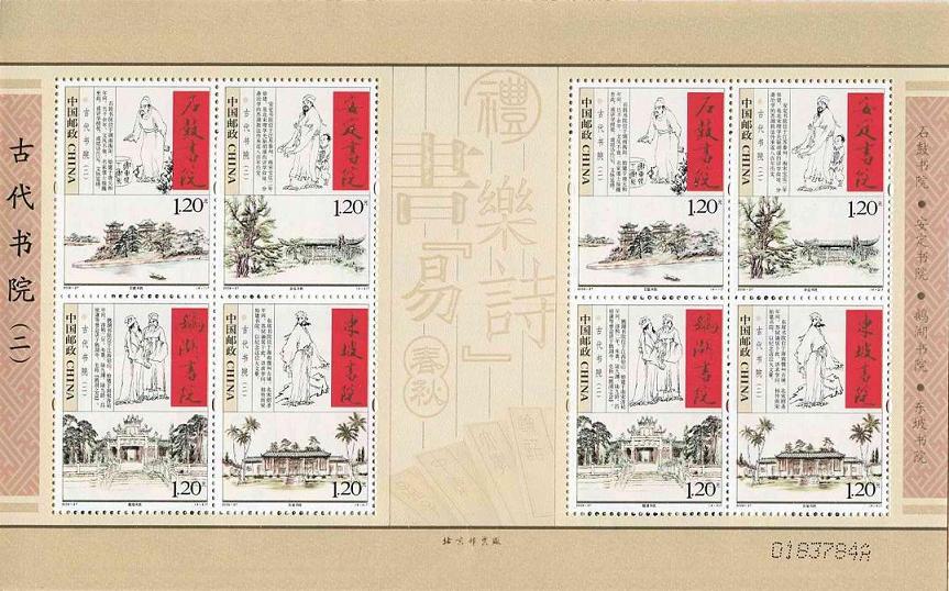 P.S. 《古代书院(二)》特种邮票全套四枚,分别为江苏泰州的安定书院、湖南衡阳的石鼓书院、江西铅山的鹅湖书院、海南儋州的东坡书院,由我国当代国画大师范曾和邹玉利共同设计。1998年4月,国家邮政总局曾经发行《古代书院》特种邮票,分别为:应天书院、嵩阳书院、岳麓书院、白鹿书院。