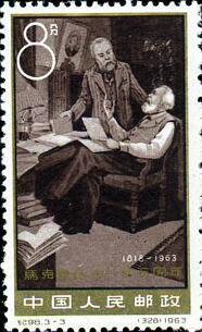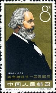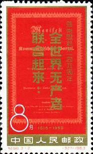 1963年5月5日,是马克思诞生145周年,我国邮电部发行“马克思诞生一四五周年”纪念邮票,编号纪98,全套3枚。其中第三枚“马克思和恩格斯在一起”,描绘了马克思和恩格斯在一起工作的情景,马克思洋坐在椅子上,左手拿着稿纸,右手作着手势,仿佛在向恩格斯阐述自己的观点。恩格斯站在马克思身旁,右手扶着一本书,左手放在椅背上,聚精会神的听马克思的讲述。展现出马克思和恩格斯之间的真挚友谊。