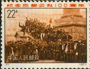 (8)主图是保存至今的当年巴黎公社使用过的一面红旗,旗子上印有文字。(9)主图再现了巴黎无产阶级当年高举武器、揭竿而起的情形。(10)主图上巴黎公社的社员正集结在一起,宣告第一个无产阶级革命政权的诞生。(11)主图上红旗飞舞,群情激昂,巴黎公社社员集结在国际广场上,决心保卫公社,保卫革命。
