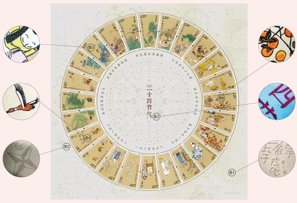 《二十四节气》系列邮票从2014年开始历时5年,终于要画上圆满的句号。《二十四节气》系列邮票都使用扇形的特殊规格,不仅是中国特色的设计元素,也是为了最终的“团圆”所埋下的伏笔。我们中国文化对圆型,有着特别的情感倾向,它不仅寓意着周而复始、无始无终,还寓意着圆满、团圆。