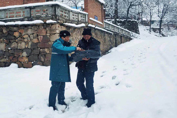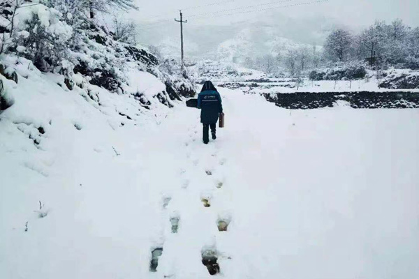 林州市东姚支局投递员索兴林不畏严寒,步行投递包裹。