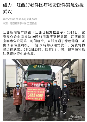 2月2日,宜春爱心企业欲捐助10吨84消毒液支援武汉,江西邮政宜春市分公司第一时间响应,立即开通了绿色通道,派出 2 名专业司机,一辆13 吨邮政厢式货车,免费将物资运往武汉。2月2日23时,历时8个小时,邮车顺利抵达武汉物资中转仓库。