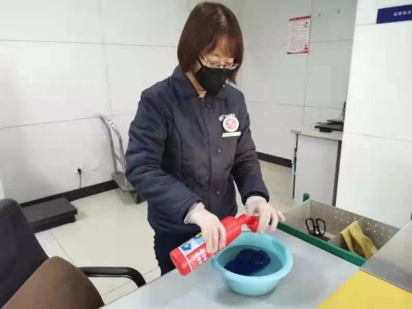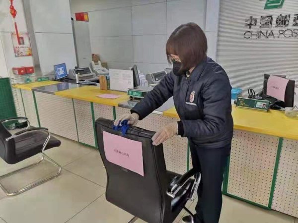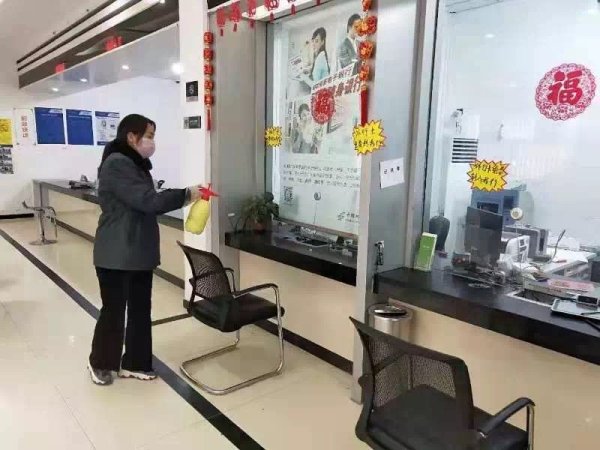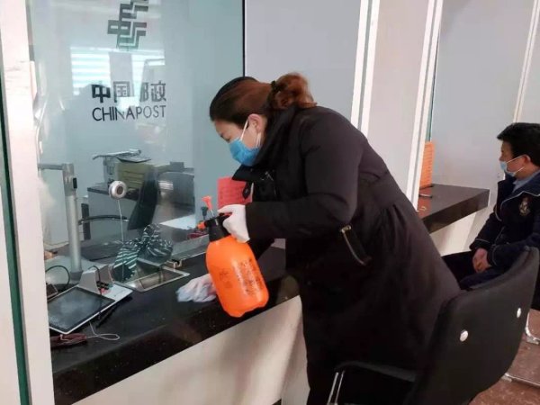 新乡市邮政分公司和平大道支局认真做好营业厅消毒工作,每日用消毒水擦拭网点设备、用具和桌椅
