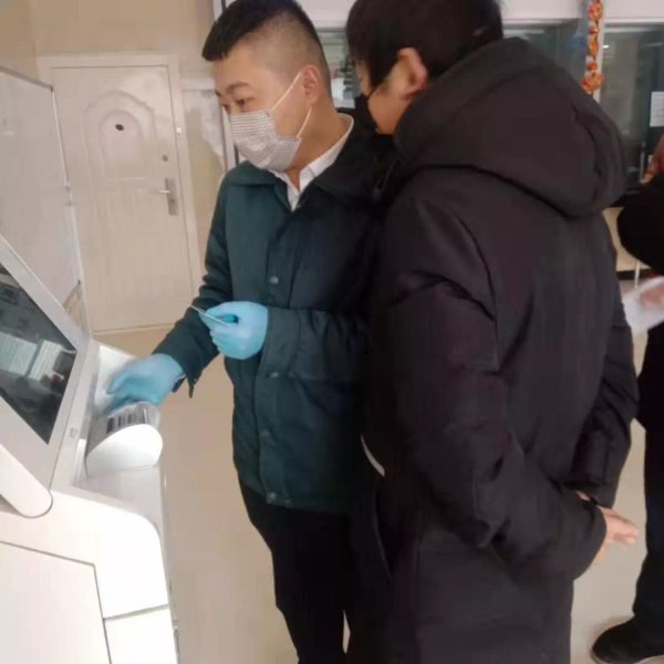 驻马店市邮政分公司为到网点办理业务的客户测量体温