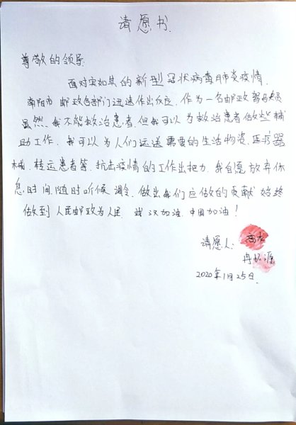 “你要去湖北?我也符合条件,也是90后,我也报名!”我的同事高龙也勇敢地站了出来。虽然我们俩年轻,身体条件好,但是,以前并没有经历过这样的紧急救援事件,非常希望这次能为打赢抗疫阻击战贡献我们的微薄之力。于是,我俩同时在请战书上按下红手印。