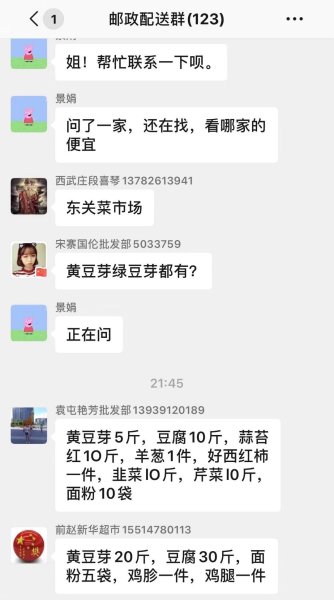 “我要黄豆芽5斤。”“我要豆腐10斤。”……每天一大早,沁阳市乡镇揽投部经理陈晓旭开设的“邮政配送”微信群里好不热闹,广大群众和村邮站负责人纷纷预订蔬菜、禽蛋和日用品。随后,陈晓旭会根据订单逐一送货上门,为此,西高村村民在微信群里留言:“陈晓旭为西高村老百姓办好事,在此西高村民表示感谢。”