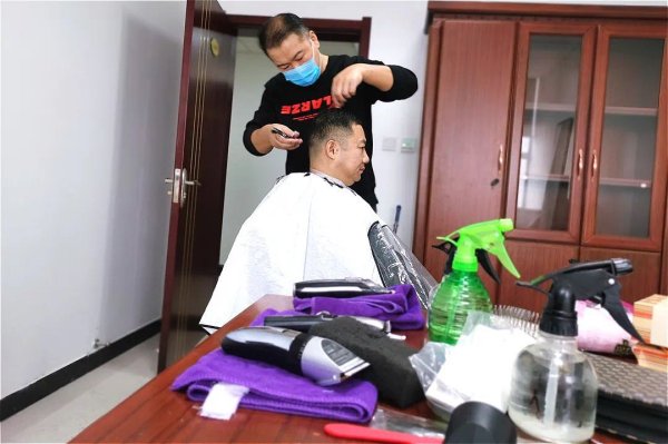 “师傅,麻烦你给理短一些,我的头发长得快,哈哈。 ”商丘市分公司财务部陈鹏开心地跟理发师交谈。为了做好疫情期间复工复产工作,商丘市分公司开展了一系列关爱职工活动,每天为职工熬制防疫中药,午饭直接送达各办公室,请理发师到单位给职工理发等,将近900名职工受益,确保了职工每天安全安心办公。“这个理发服务想得真周到,我也来理一理。”得知市分公司有理发活动,分拣班杜海波刚忙完包裹分拣工作便赶了过来,也体验了一把上门理发服务。