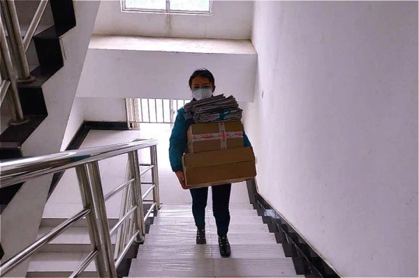 揽投员赖海霞往楼上搬运邮件信报
